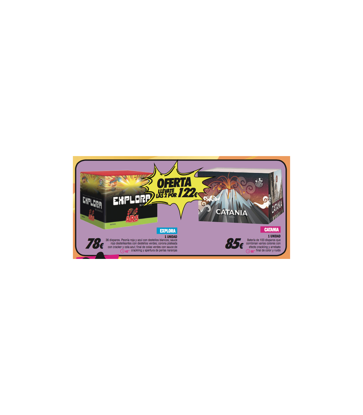 Combinación de 2 baterías de gama alta con efectos de colores, silbidos y cracker, con un total de 86 disparos.