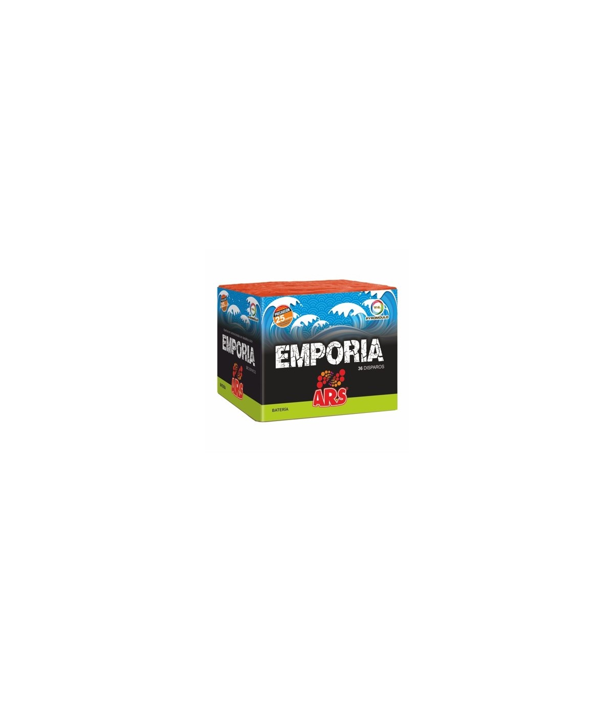 La Batería Emporia de 36 disparos realiza efectos con destellos rojos y cola verde, cola roja y cola azul con crackling. Duración aproximada 40 segundos.